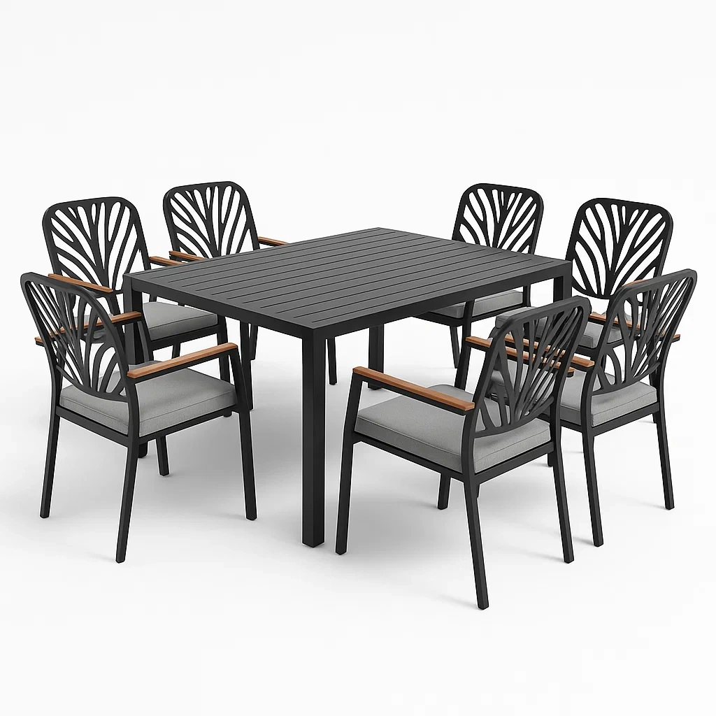 El conjunto incluye 7 sillas y 1 mesa, adecuado para uso tanto en interiores como en exteriores. El conjunto requiere ensamblaje utilizando herramientas básicas, y se recomienda limpiar con un paño húmedo.