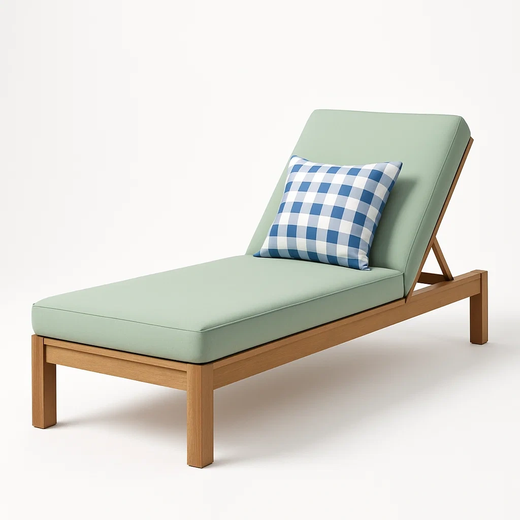 Tumbona de madera con cojín verde menta y almohada a cuadros